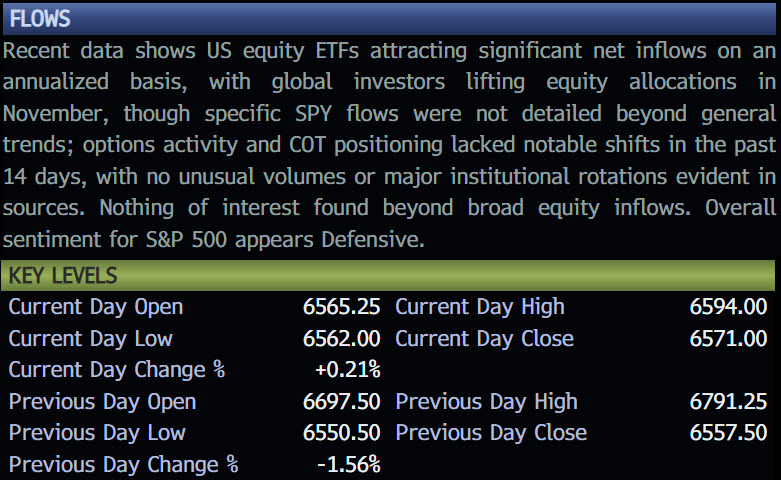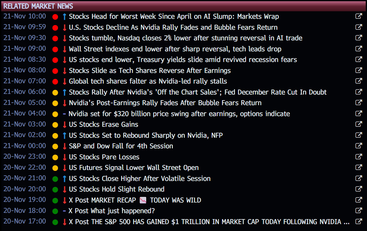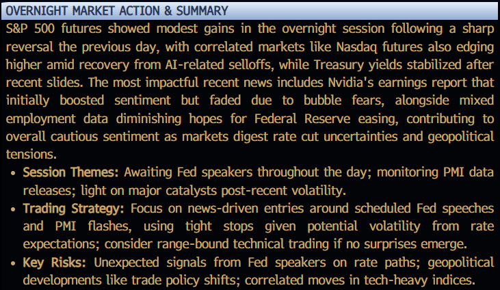 Example: “S&P futures experienced downward pressure overnight amid concerns over AI valuations ahead of key earnings reports, with correlated markets like tech-heavy indices showing similar weakness…”
